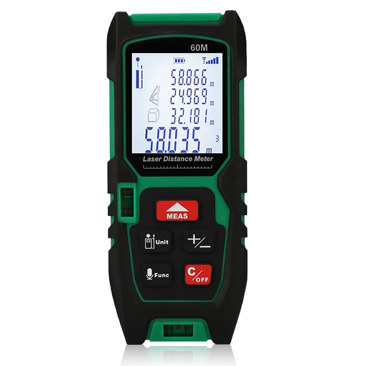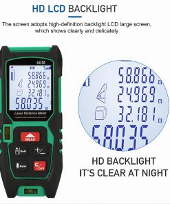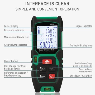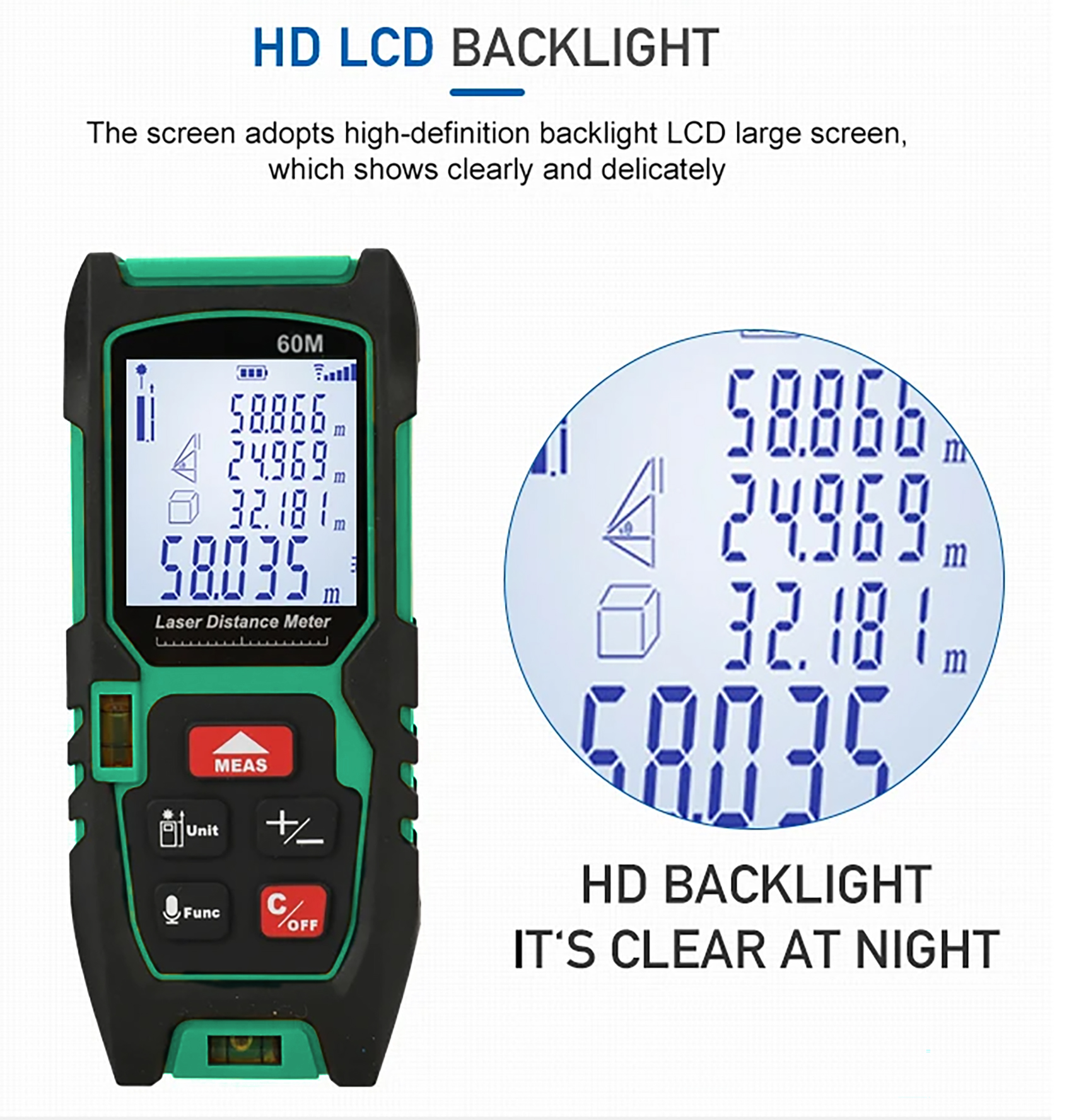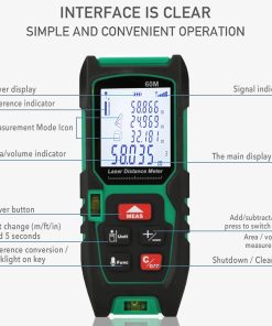 Laser Measure Tool, Accurate 196 Feet Laser Distance Meter – (m/in/ft) Portable with LCD Display – Battery-Powered – Measures Volume, Area, Pythagorean Function