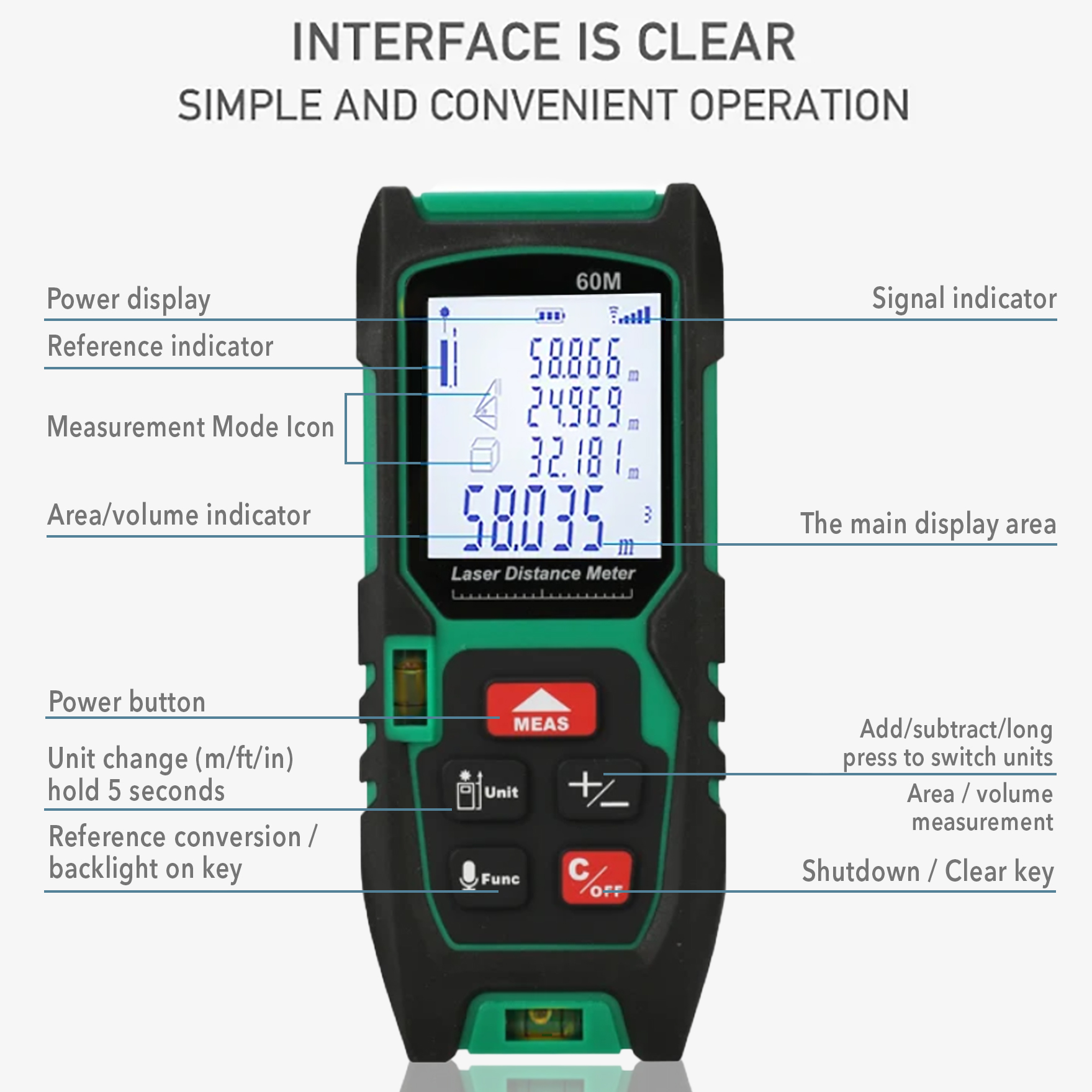 - Multi-Unit Measurement: Easily switch between meters (m), inches (in), and feet (ft) for convenience on any project.
